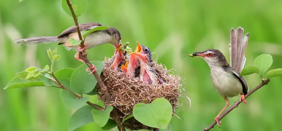 Hình ảnh chim bố mẹ đang mớm mồi cho chim con ở trong tổ.