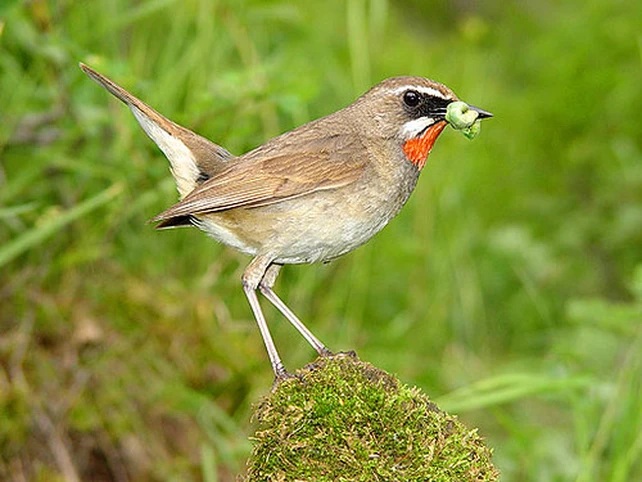 Món ăn yêu thích của chim Oanh cổ đỏ là sâu tươi, cào cào non, dế nhỏ,….Mỗi lần cho chim ăn nên đưa tay từ từ để chim quen chuyển động của bạn.