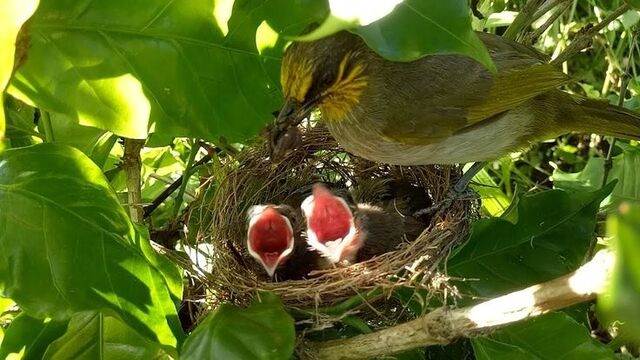 Ảnh chim mẹ đang đút mồi cho chim non.