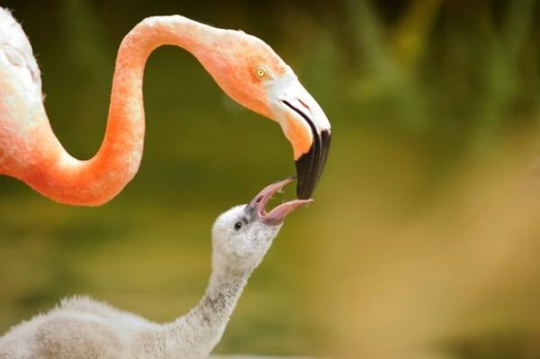 Chim Hồng hạc nuôi con bằng “sữa diều” một loại chất lỏng đặc biệt do cả chim bố và mẹ tiết ra từ tuyến trong diều.
