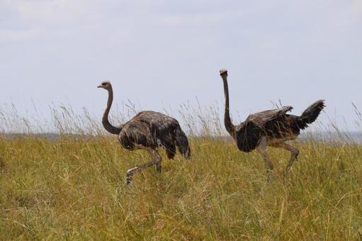 Chim đà điểu mẹ dẫn chim đà điểu con đi kiếm ăn.