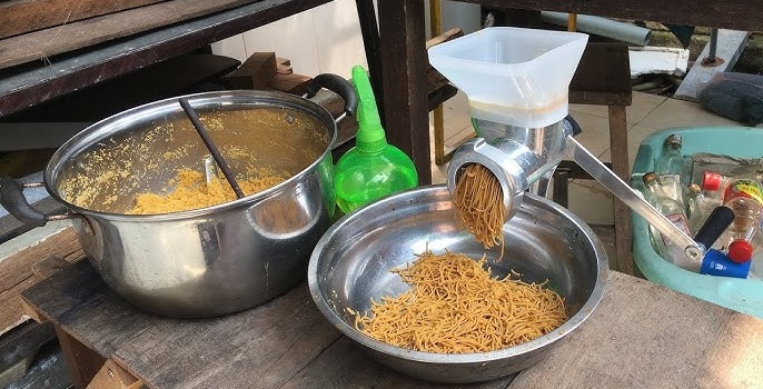 Các nguyên liệu như để làm chim chào mào gồm bột ngô, bột đậu, trứng, tôm khô, thịt bò, vitamin… sau khi trộn sẽ được máy ép thành cám viên nhỏ phù hợp với miệng chim.