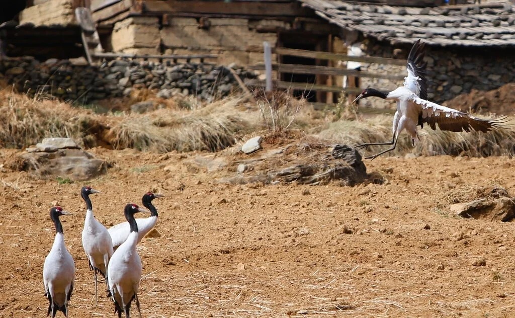 Vào mùa đông thì những đàn Sếu cổ đen sẽ di cư từ cao nguyên Tây Tạng đến thung lũng sông Phobjikha của Bhutan để kiếm ăn và trú đông.